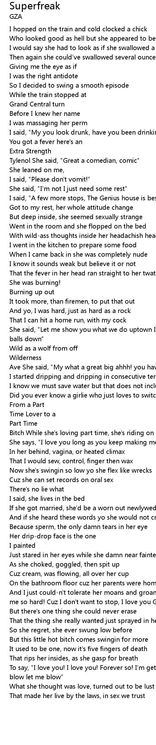 And I just could-n't tolerate her moans and groans "Genius, oh Genius, oh rock me so hard! Cuz I don't want to stop, I love you God!" |