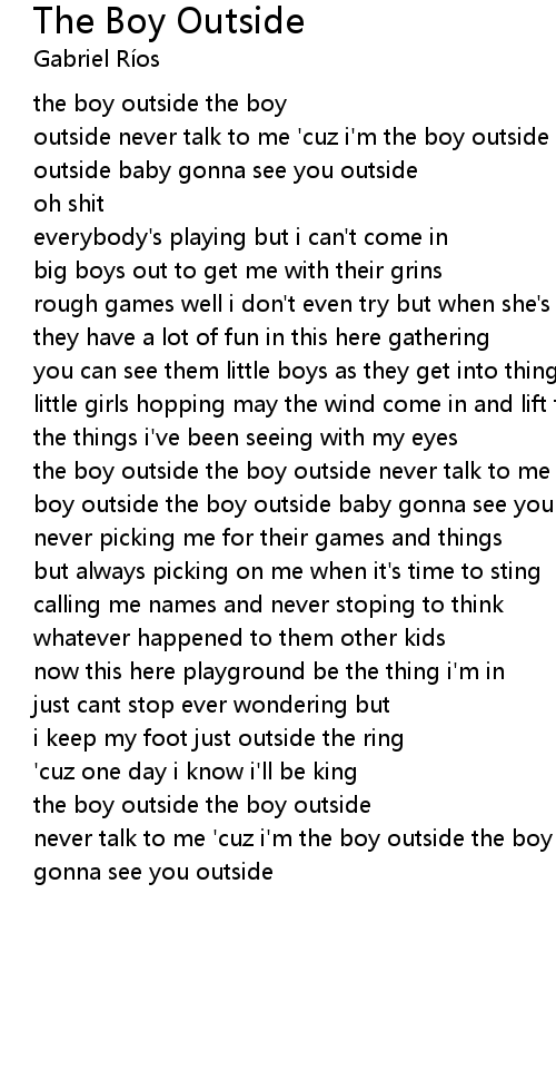 the boy outside the boy outside never talk to me 'cuz i'm the boy outside the boy outside the boy outside baby gonna see you outside |