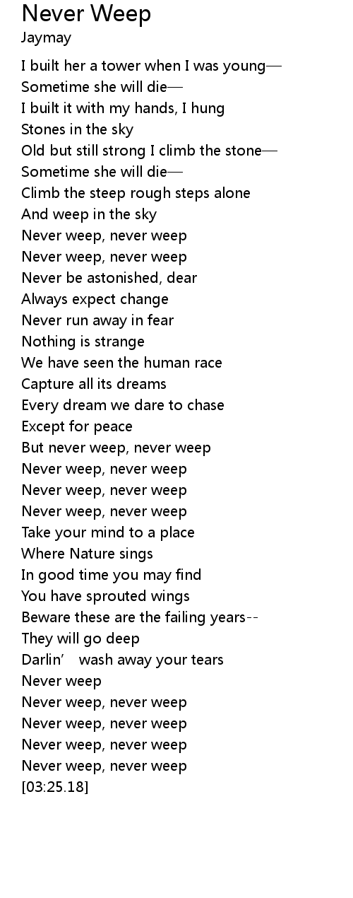 | [02:53.71] | Never weep, never weep |
