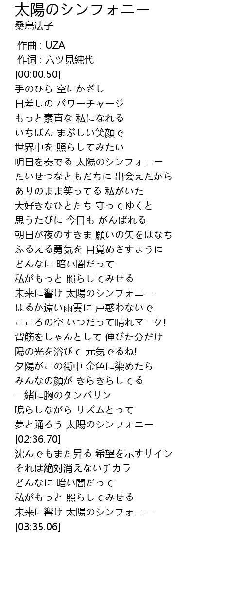 | [01:33.46] | 未来に響け 太陽のシンフォニー |