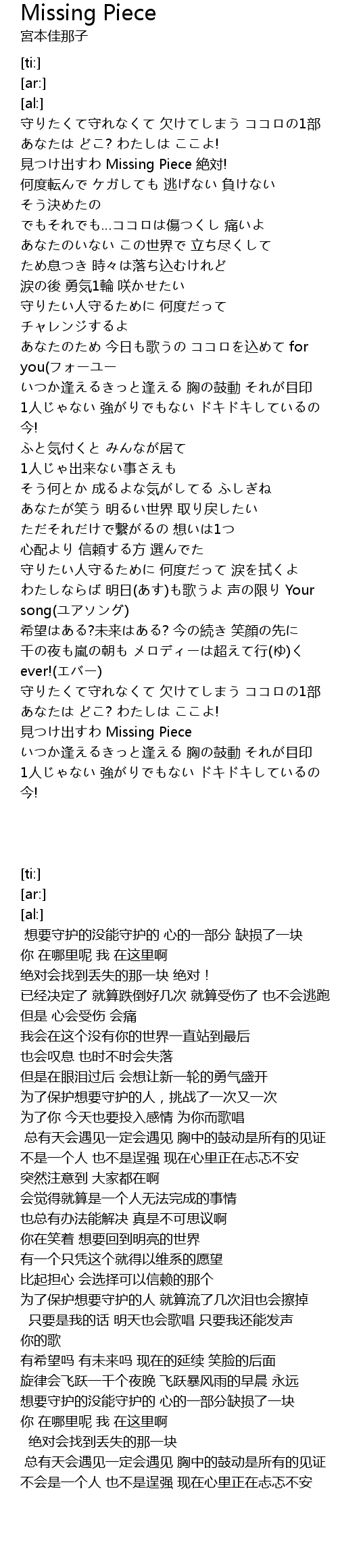 | [00:13.49] | jiàn chū Missing Piece jué duì! |