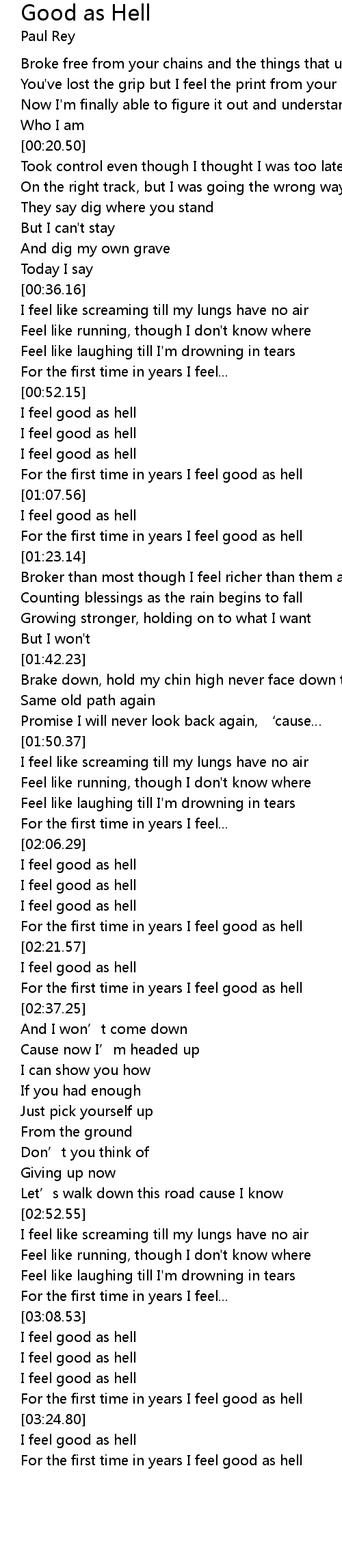 | [02:08.22] | I feel good as hell |
