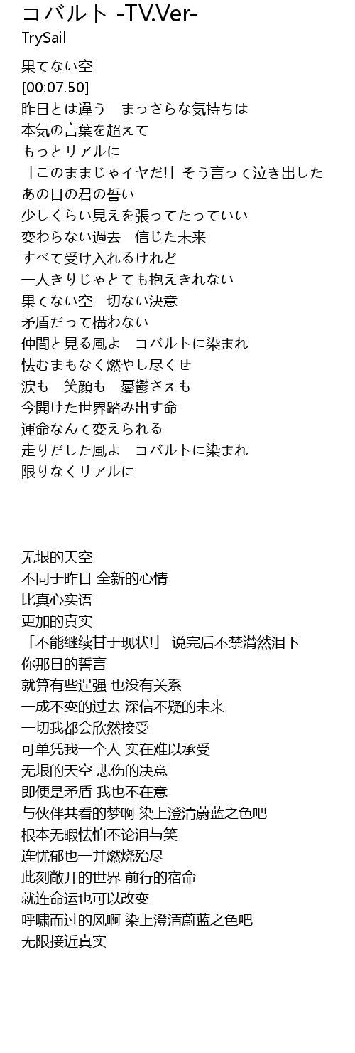 | [00:58.19] | 仲間と見る風よ コバルトに染まれ |