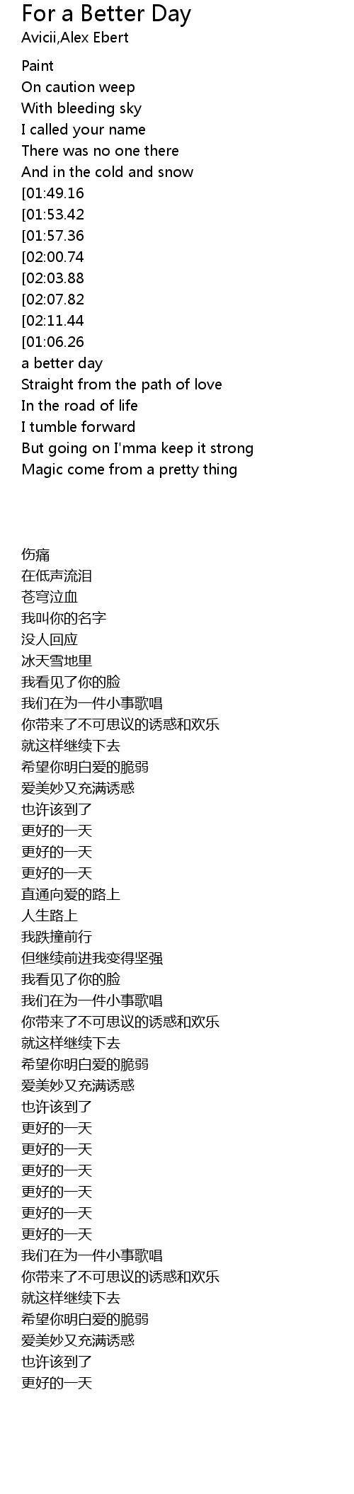 | [00:59.13][01:06.26][01:13.12][02:17.26][02:24.32][02:31.40][02:35.28][02:38.57][02:42.02][03:10.76] | For a better day |