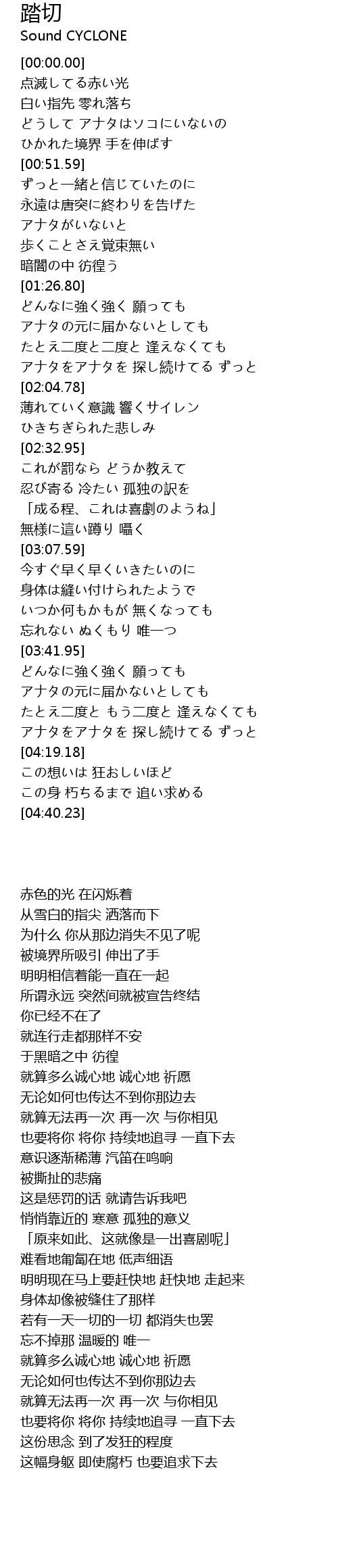 | [02:18.87] | 薄れていく意識 響くサイレン |