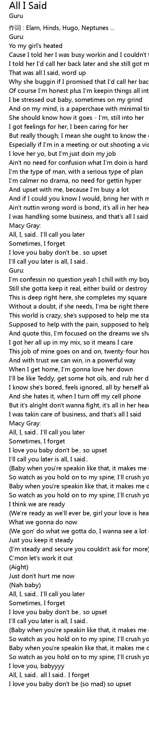 | Why she buggin if I promised that I' d call her back | |