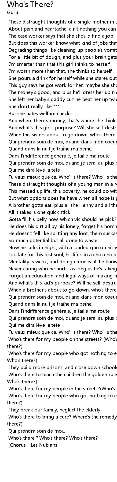 | [02:36.384] | Who's there for my people on the streets? (Who's there? Who's there?) |