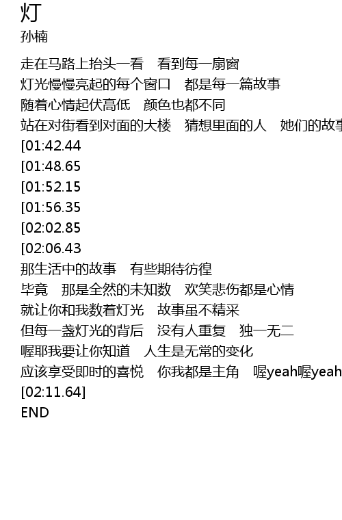 | [00:23.33] | 灯光慢慢亮起的每个窗口 都是每一篇故事 |