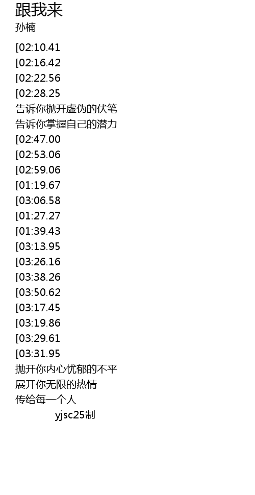 | [03:35.19][03:38.26] | 请你跟我来请你跟我来 |