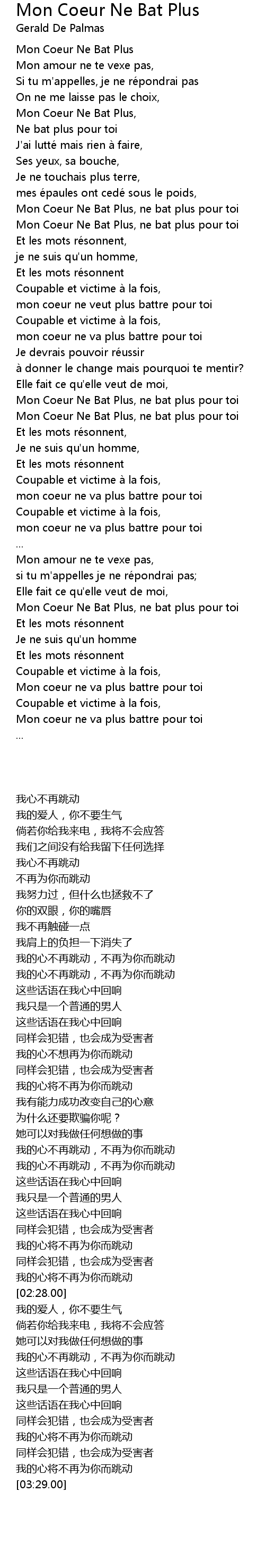 | [02:58.00] | Mon Coeur Ne Bat Plus, ne bat plus pour toi |