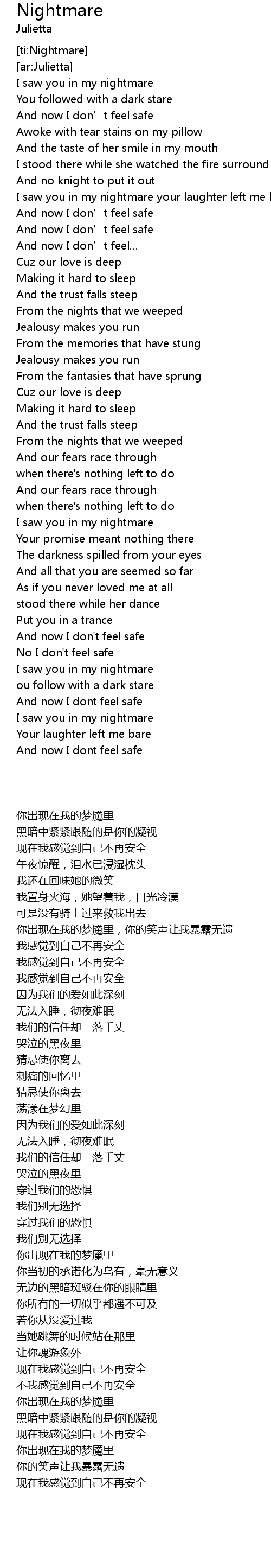 | [00:30.68] | I saw you in my nightmare your laughter left me bare |
