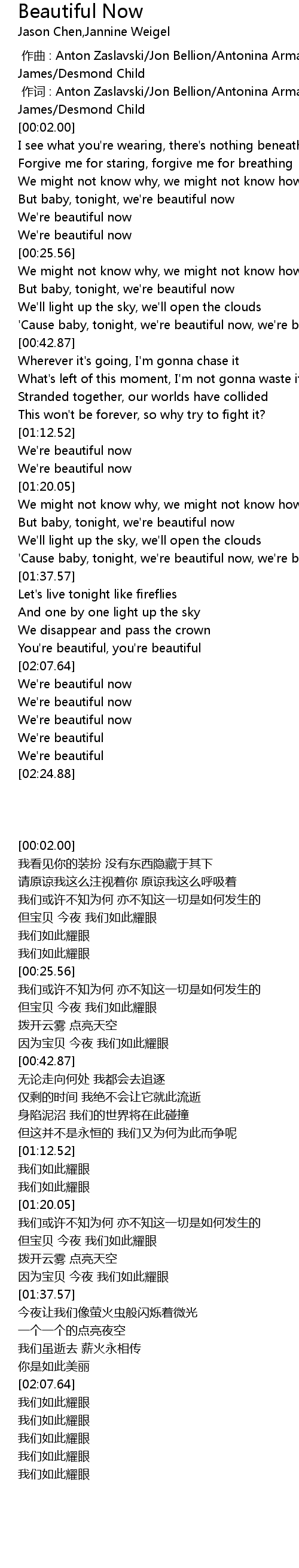 | [00:37.57] | 'Cause baby, tonight, we're beautiful now, we're beautiful |