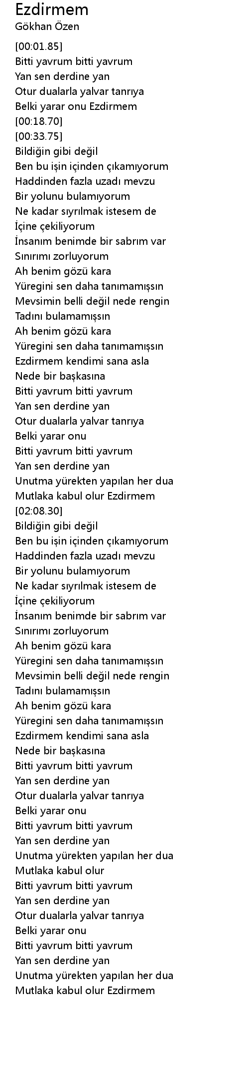 | [00:13.47] | Belki yarar onu Ezdirmem |