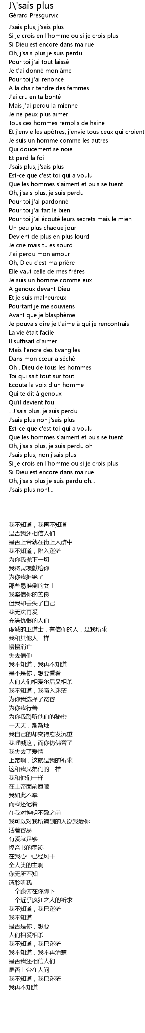 | [01:13.710] | Et j' envie les ap tres, j' envie tous ceux qui croient |