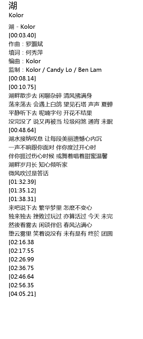 | [00:00.15] | 湖 - Kolor |