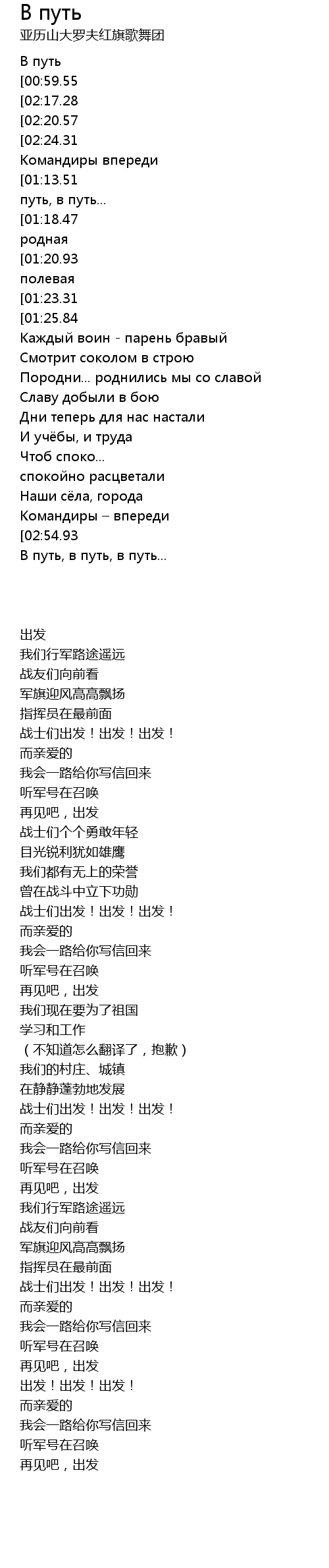 | [00:43.66][01:13.51][01:43.69][02:30.43] | Солдаты, в путь, в путь, в путь... |