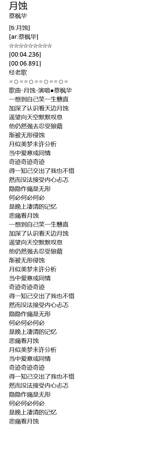 | [00:13.893] | 歌曲-月蚀-演唱●蔡枫华 |