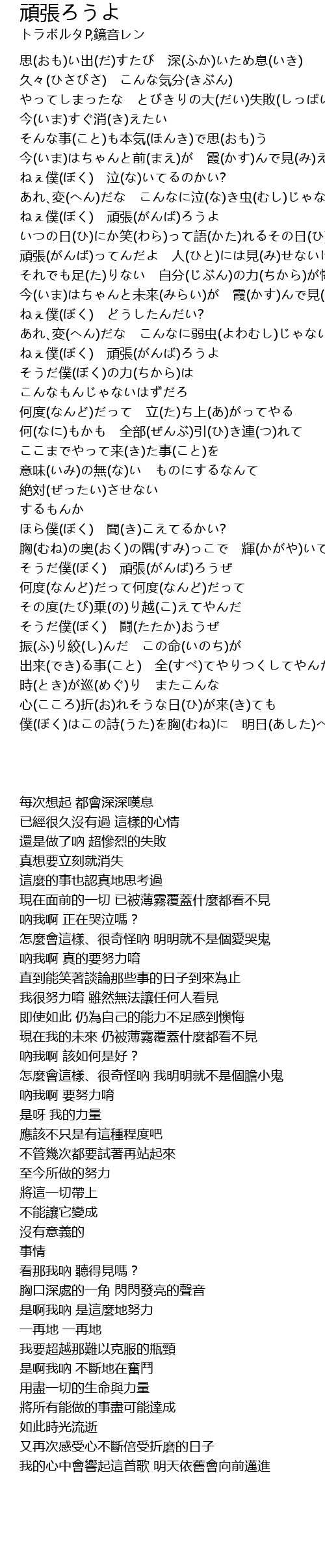 | [01:07.08] | ねぇ僕(ぼく) 頑張(がんば)ろうよ |