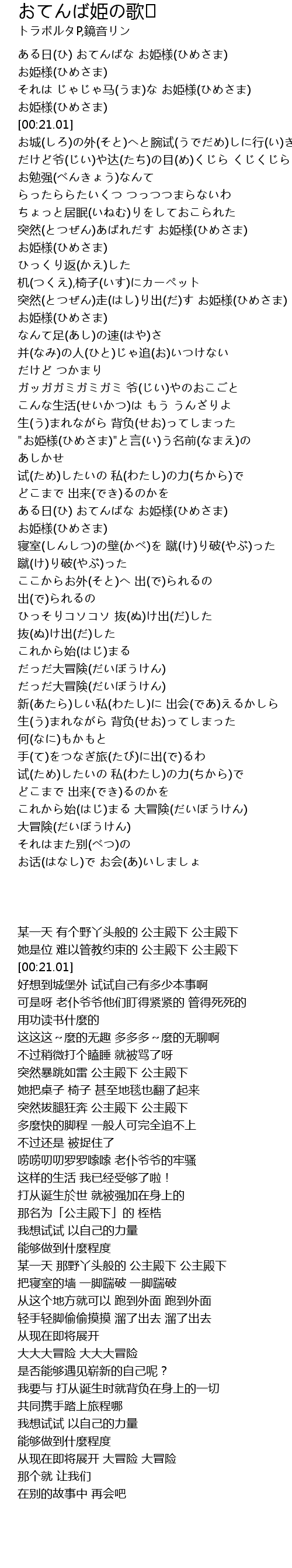 | [00:09.90] | ある日(ひ) おてんばな お姫様(ひめさま) お姫様(ひめさま) |