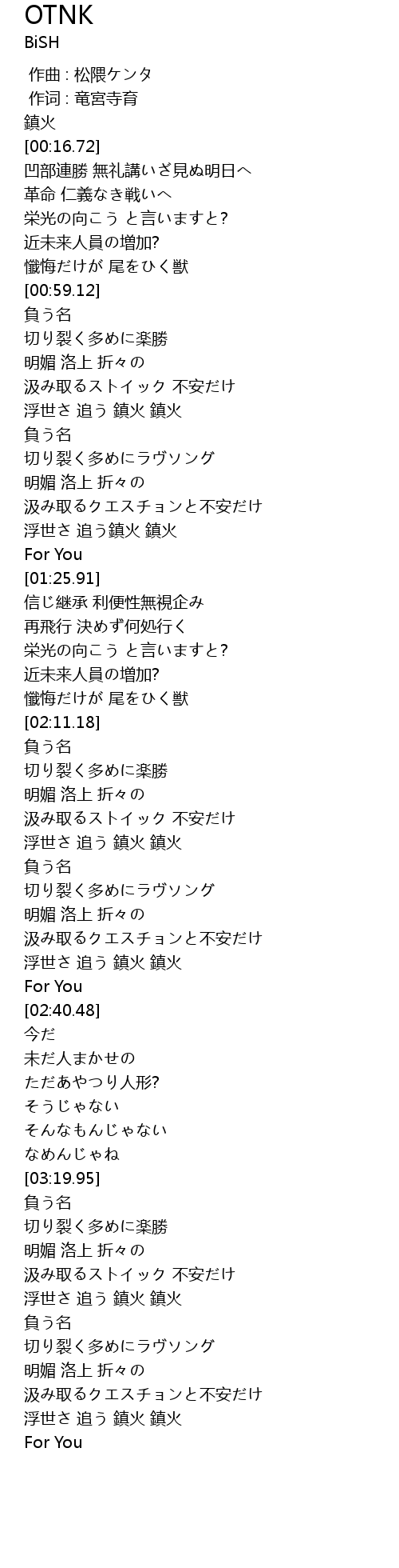 | [01:10.12] | 浮世さ 追う 鎮火 鎮火 |
