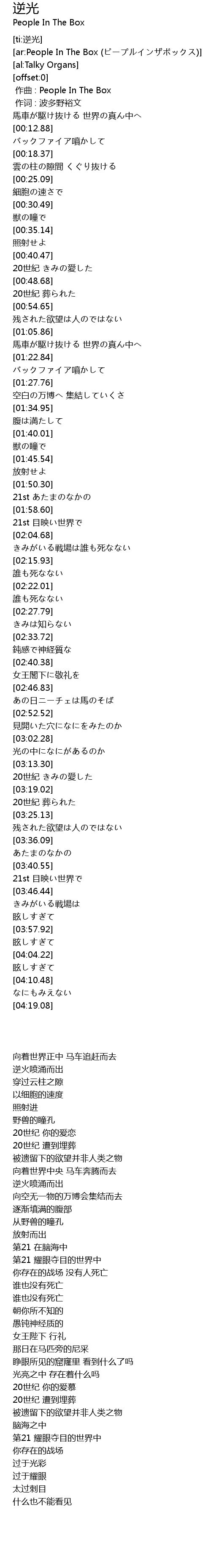 | [00:19.33] | 雲の柱の隙間 くぐり抜ける |