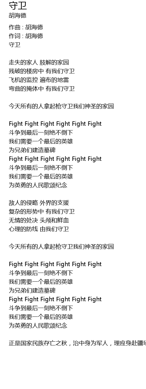 | zheng shi guo jia min zu cun wang zhi qiu, zhi zhong shen wei jun ren, li ying shen fu jiang chang he ge fen zhan, bao wei wo shen sheng ling tu, dan qiu ma ge guo shi, bu yuan ren ru tou sheng, ru bu xing xi sheng, wang neng yi re xue tou lu huan qi quan min kang zhan, qian fu hou ji, jian chi zhan dou |