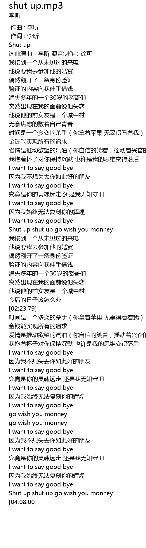 | [04:04.75] | Shut up shut up go wish you monney |