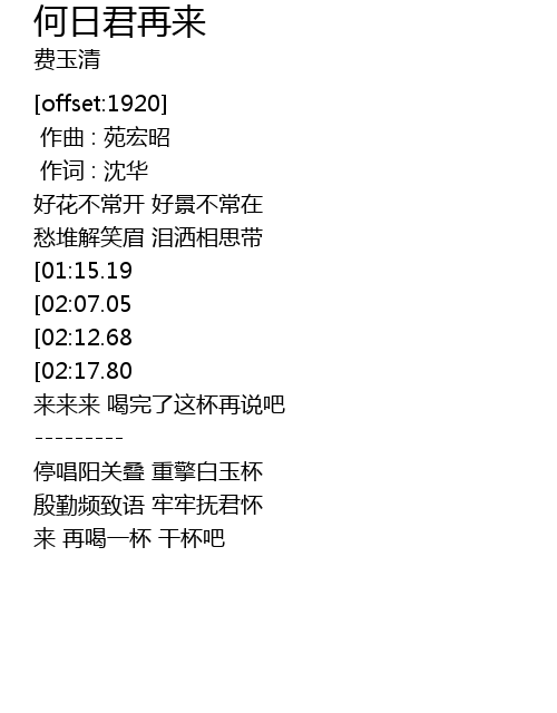 | [00:44.04][01:15.19][01:56.68][02:27.88] | 今宵离别后 何日君再来 |