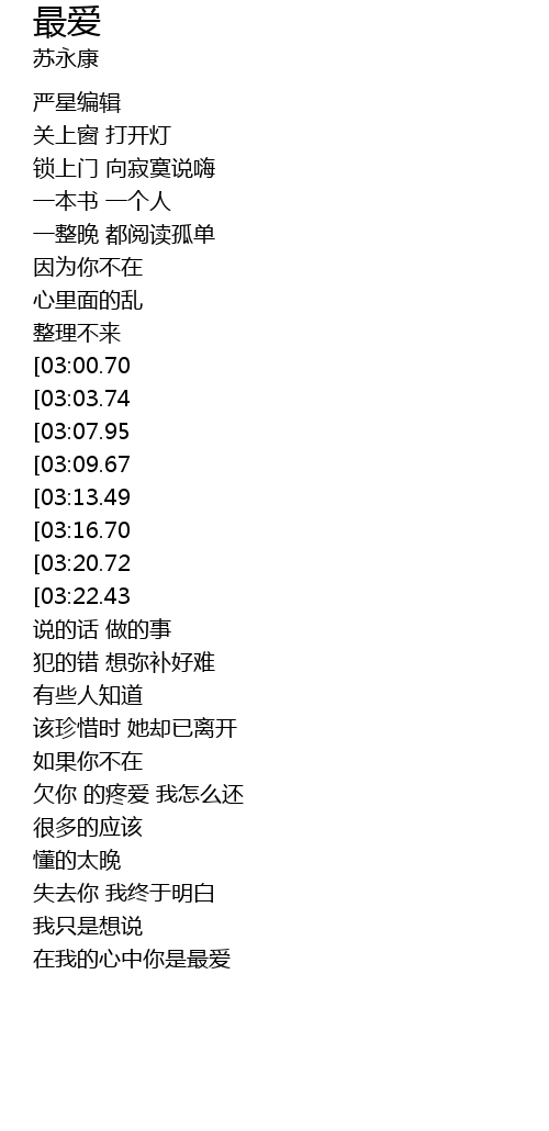 | [03:48.18][03:22.43][02:57.02][01:49.68][00:58.56] | wo hai shi ni de zui ai |