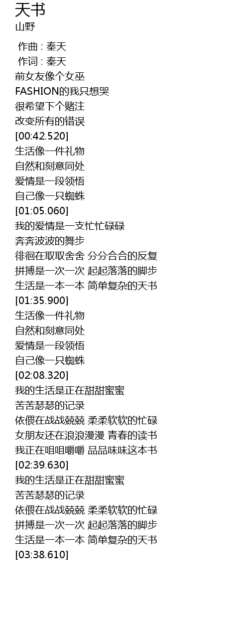 | [03:27.000] | shēng huó shì yī běn yī běn jiǎn dān fù zá de tiān shū |