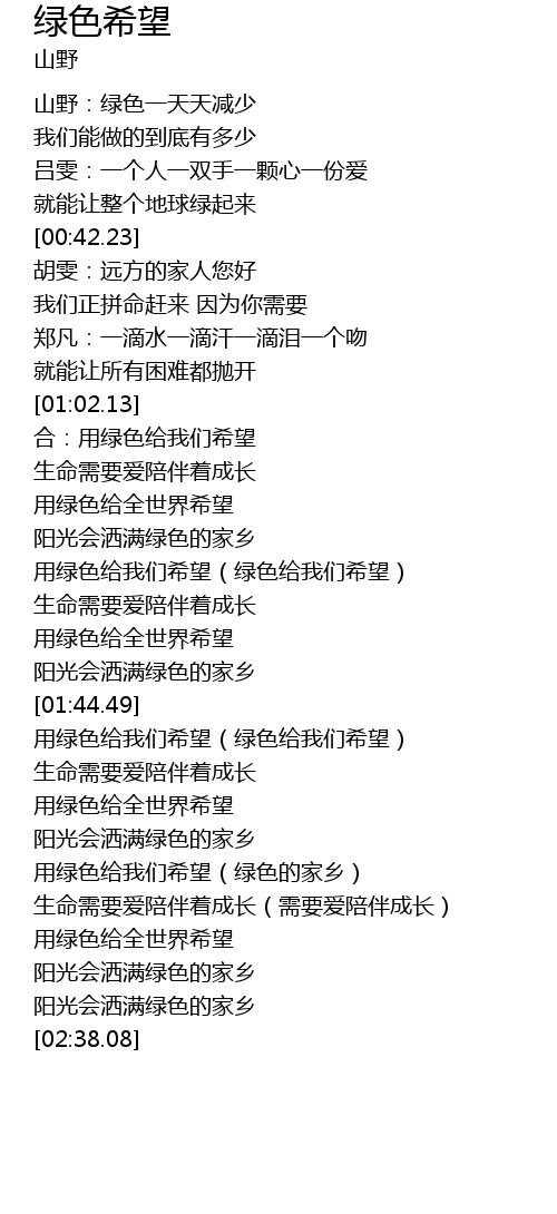 | [02:06.13] | 用绿色给我们希望(绿色的家乡) |