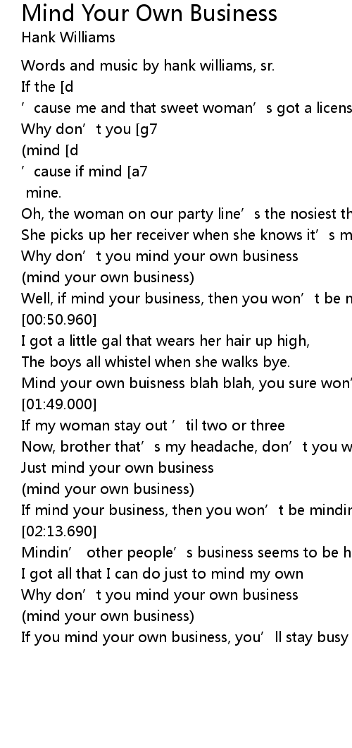 | [02:06.040] | If mind your business, then you won’t be mindin’ mine. |