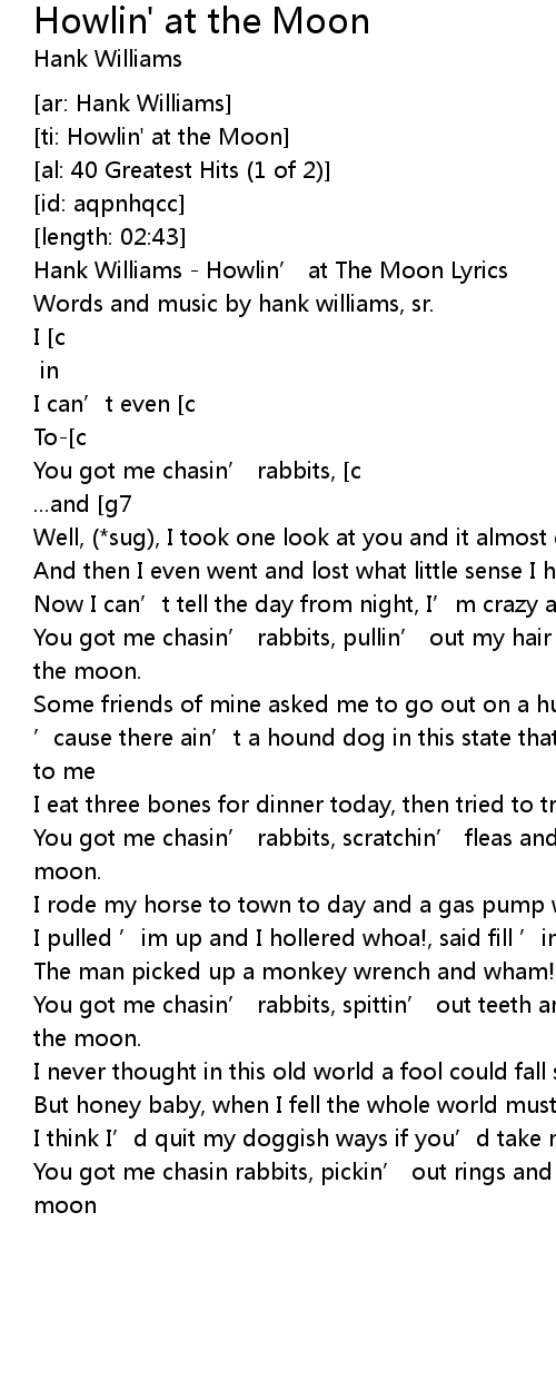 | [00:00.00] | Hank Williams - Howlin’ at The Moon Lyrics |