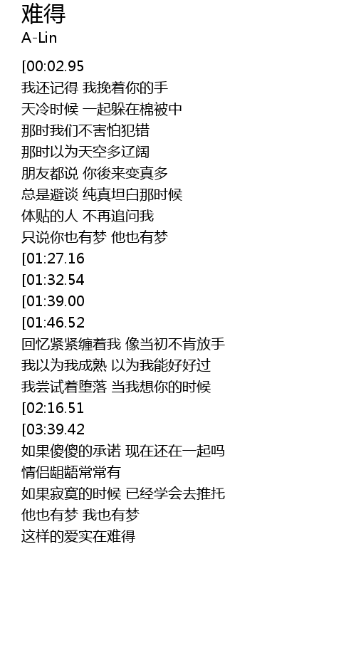 | [03:12.79][01:27.16] | 虽然难得 不必心痛 |