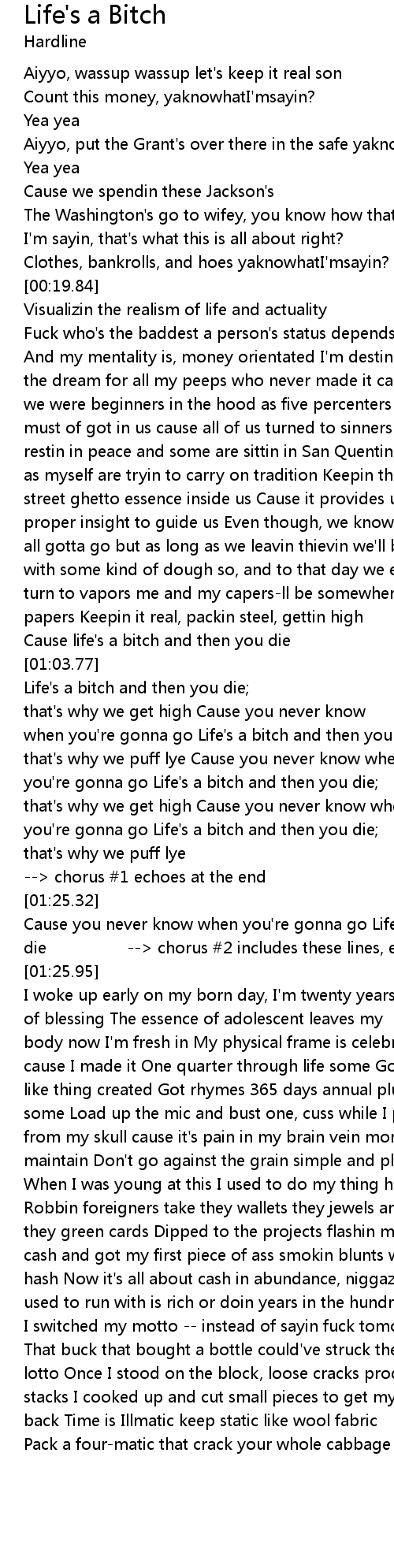 Cause you never know when you're gonna go Life's a bitch and then you die --> chorus #2 includes these lines, echoes at the end |