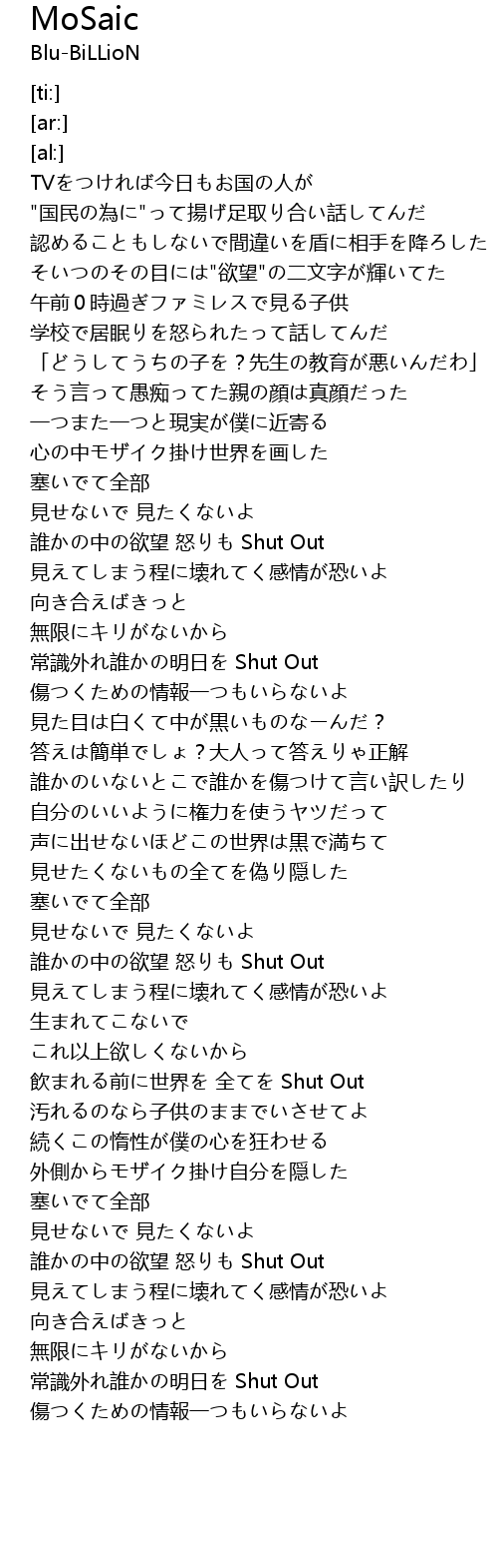 | [02:39.57] | 飲まれる前に世界を 全てを Shut Out |
