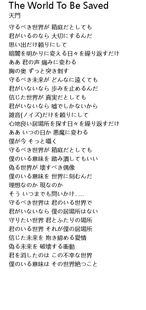 | [03:46.28] | 守るべき世界は 君のいる世界で |