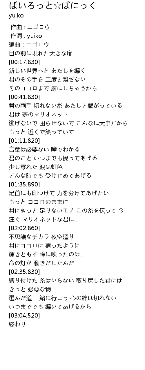 | [00:41.830] | 君の両手 切れない糸 あたしと繋がっている |