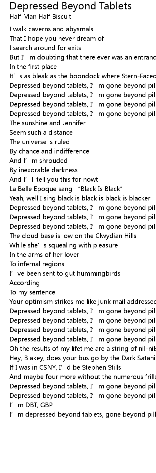 | Depressed beyond tablets, I' m gone beyond pills | |