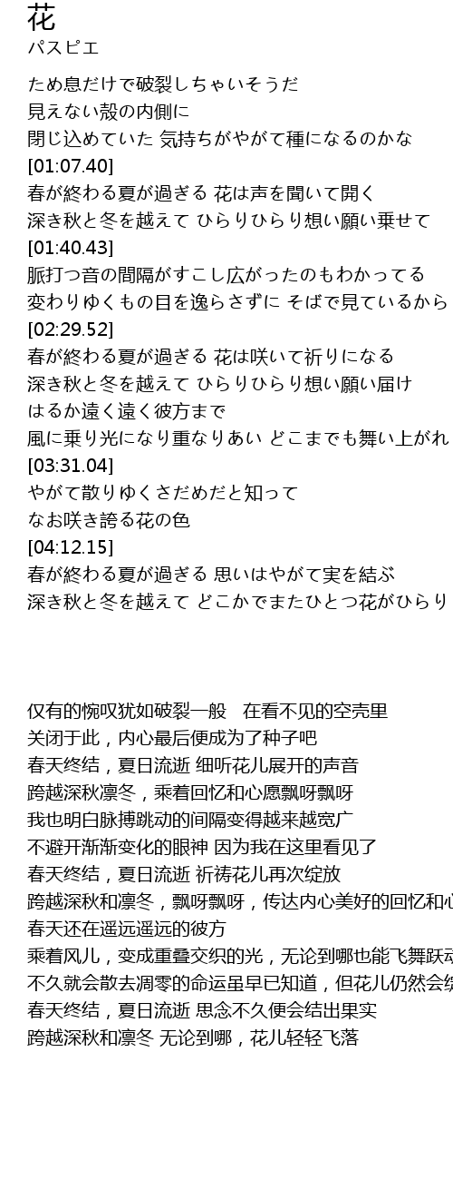 | [04:26.47] | 深き秋と冬を越えて どこかでまたひとつ花がひらり |
