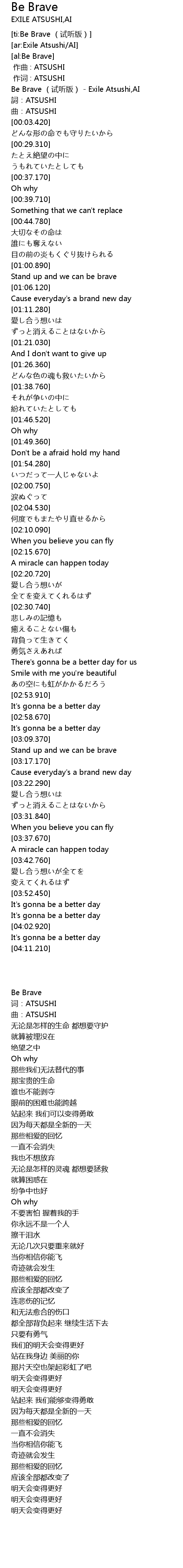 | [00:00.520] | Be Brave shì tīng bǎn Exile Atsushi, AI |