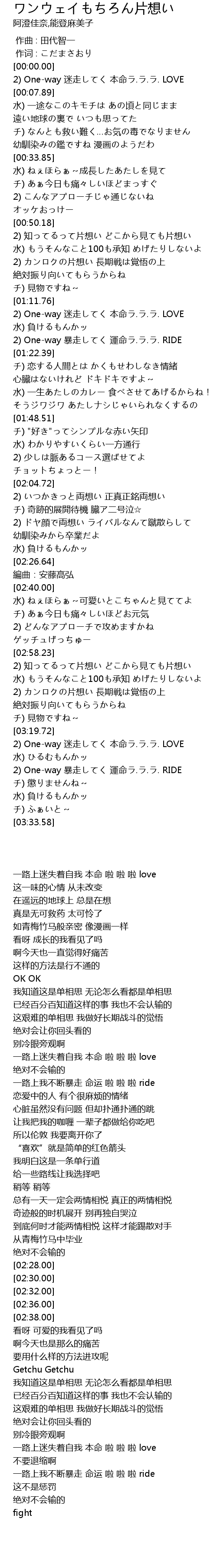 | [03:20.03] | 2) One-way 迷走してく 本命ラ.ラ.ラ. LOVE |