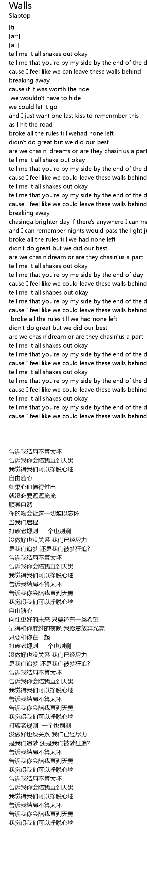 | [00:00.73] | tell me it all snakes out okay |