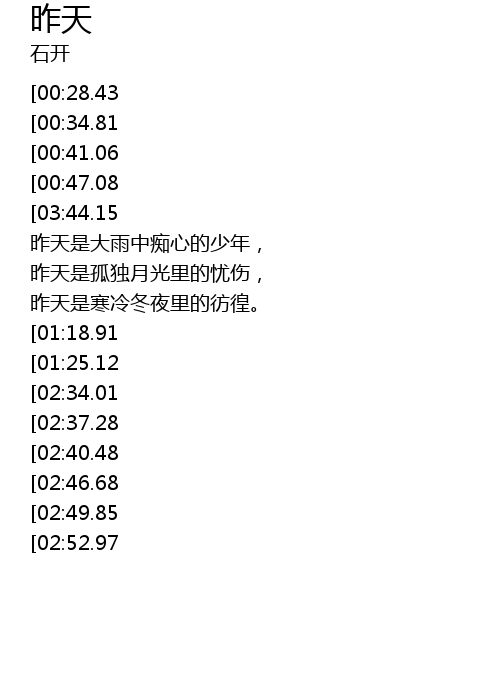 | [03:25.24][00:28.43] | 昨天是发黄相片上纯纯地脸, |