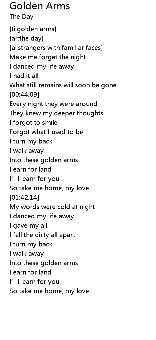| [01:22.27] | Into these golden arms |