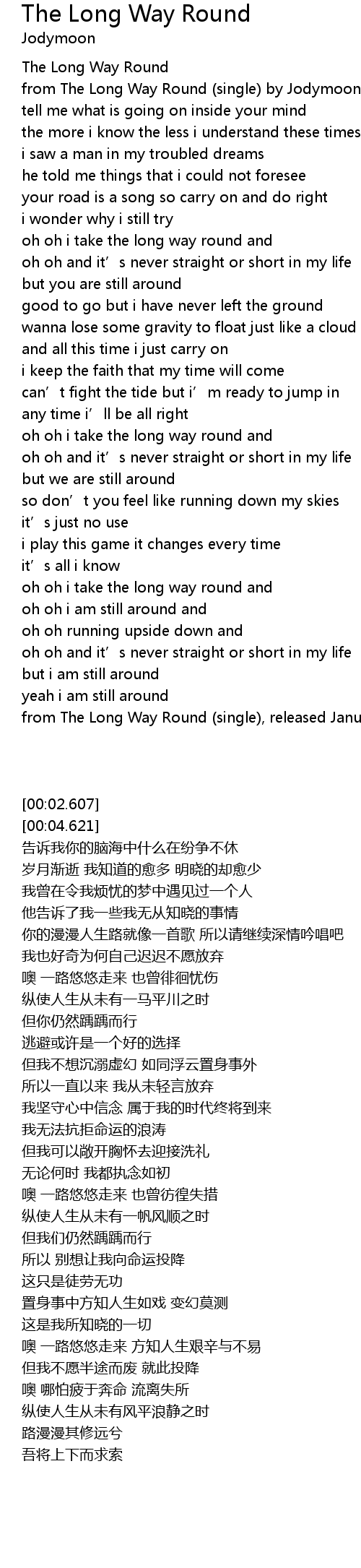 | [00:04.621] | from The Long Way Round (single) by Jodymoon |
