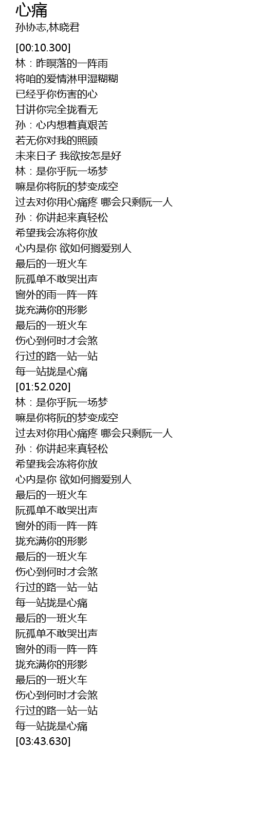 | [03:39.220] | 每一站拢是心痛 |