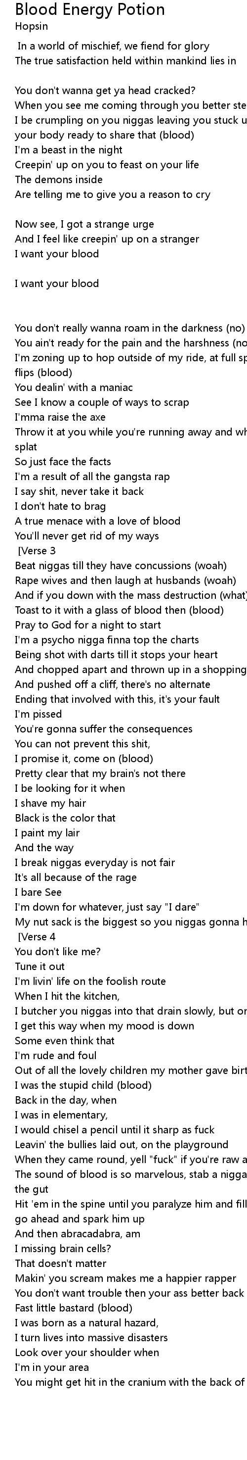 | The sound of blood is so marvelous, stab a nigga in his stomach till you scar the gut | |