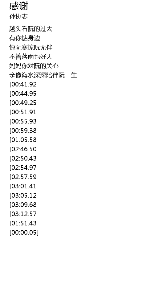 | [03:45.88][03:01.41][01:25.56] | 乎阮感谢你 妈妈 |
