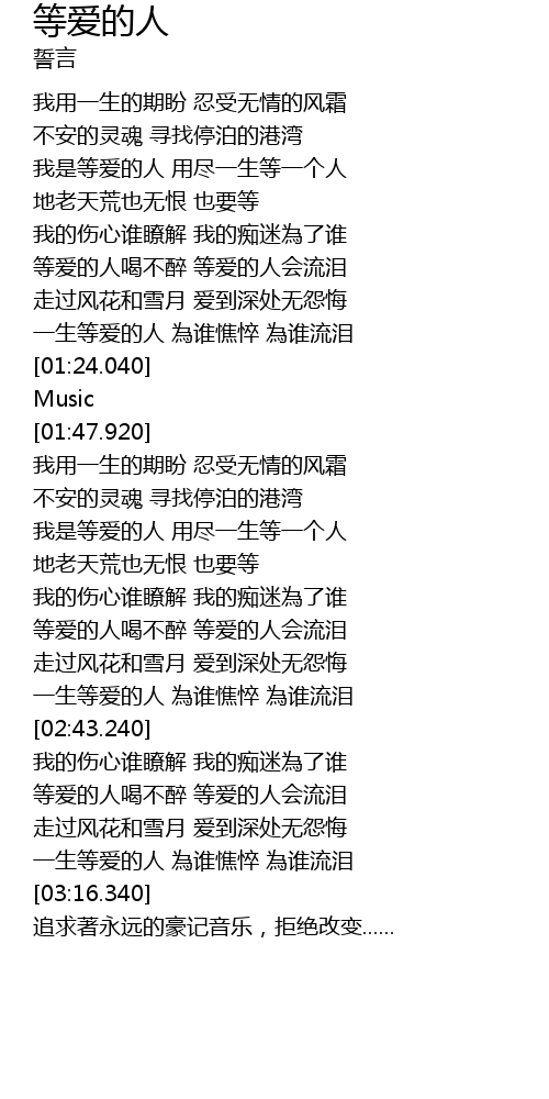 | [01:15.270] | 一生等爱的人 為谁憔悴 為谁流泪 |